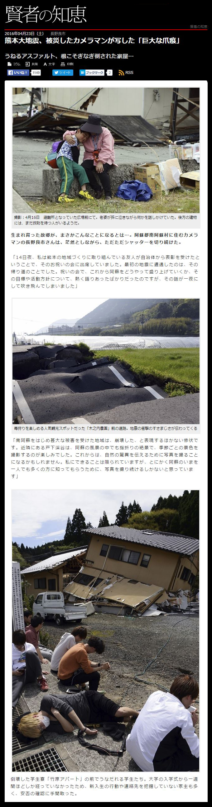 南阿蘇村在住の長野良市組合員の熊本地震の写真が週刊金曜日(5/13発売)と現代ビジネスに掲載されました。(各社の転載許可の下、公開いたします)